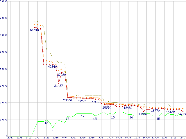 ※このグラフは過去のデータも税率5%相当に調整した税込み相当額のグラフです。 税率変更や、総額表示方式導入(2004年4月)の影響は除いています。 | | | ●凡例 | 最安値 (点線部は販売店未確認 または未調査) | 平均値 | 最高値 | ショップ数 |
