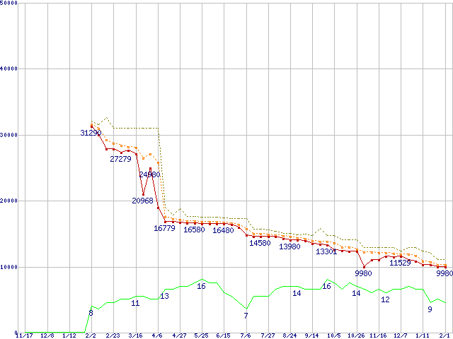 ※このグラフは過去のデータも税率5%相当に調整した税込み相当額のグラフです。 税率変更や、総額表示方式導入(2004年4月)の影響は除いています。 | | | ●凡例 | 最安値 (点線部は販売店未確認 または未調査) | 平均値 | 最高値 | ショップ数 |