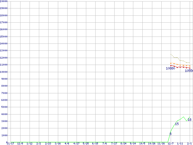 ※このグラフは過去のデータも税率5%相当に調整した税込み相当額のグラフです。 税率変更や、総額表示方式導入(2004年4月)の影響は除いています。 | | | ●凡例 | 最安値 (点線部は販売店未確認 または未調査) | 平均値 | 最高値 | ショップ数 |