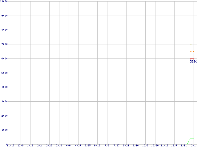 ※このグラフは過去のデータも税率5%相当に調整した税込み相当額のグラフです。 税率変更や、総額表示方式導入(2004年4月)の影響は除いています。 | | | ●凡例 | 最安値 (点線部は販売店未確認 または未調査) | 平均値 | 最高値 | ショップ数 |