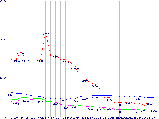 メモリ主要製品(最安値5千円未満)の最安値推移
