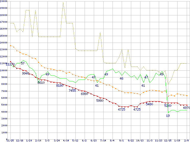 ※このグラフは過去のデータも税率5%相当に調整した税込み相当額のグラフです。 税率変更や、総額表示方式導入(2004年4月)の影響は除いています。 | | | ●凡例 | 最安値 (点線部は販売店未確認 または未調査) | 平均値 | 最高値 | ショップ数 |