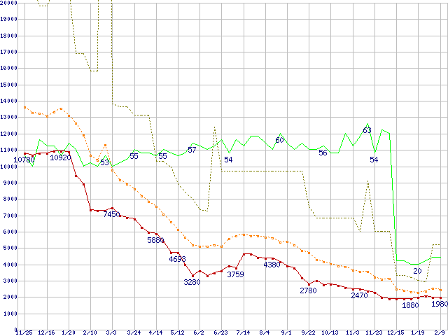 ※このグラフは過去のデータも税率5%相当に調整した税込み相当額のグラフです。 税率変更や、総額表示方式導入(2004年4月)の影響は除いています。 | | | ●凡例 | 最安値 (点線部は販売店未確認 または未調査) | 平均値 | 最高値 | ショップ数 |