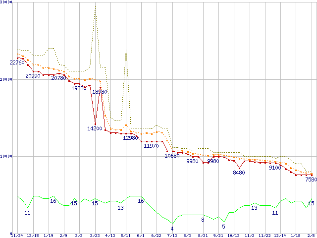 ※このグラフは過去のデータも税率5%相当に調整した税込み相当額のグラフです。 税率変更や、総額表示方式導入(2004年4月)の影響は除いています。 | | | ●凡例 | 最安値 (点線部は販売店未確認 または未調査) | 平均値 | 最高値 | ショップ数 |