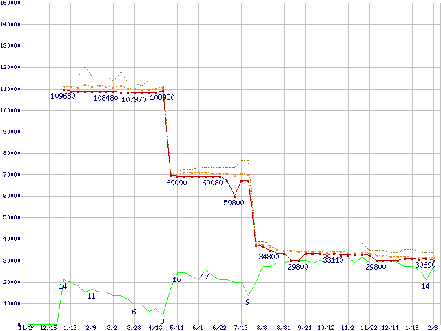 | Core 2 Quad Q6600 (2.40GHz,L2 4MB×2)の価格推移 | | | (2006年11月24日~2008年2月8日) |