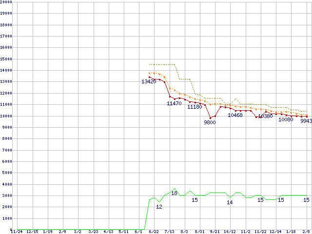 ※このグラフは過去のデータも税率5%相当に調整した税込み相当額のグラフです。 税率変更や、総額表示方式導入(2004年4月)の影響は除いています。 | | | ●凡例 | 最安値 (点線部は販売店未確認 または未調査) | 平均値 | 最高値 | ショップ数 |