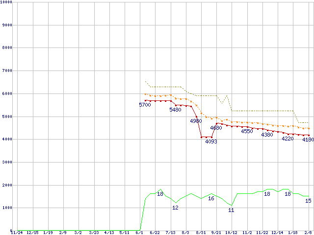 ※このグラフは過去のデータも税率5%相当に調整した税込み相当額のグラフです。 税率変更や、総額表示方式導入(2004年4月)の影響は除いています。 | | | ●凡例 | 最安値 (点線部は販売店未確認 または未調査) | 平均値 | 最高値 | ショップ数 |