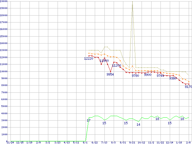 ※このグラフは過去のデータも税率5%相当に調整した税込み相当額のグラフです。 税率変更や、総額表示方式導入(2004年4月)の影響は除いています。 | | | ●凡例 | 最安値 (点線部は販売店未確認 または未調査) | 平均値 | 最高値 | ショップ数 |