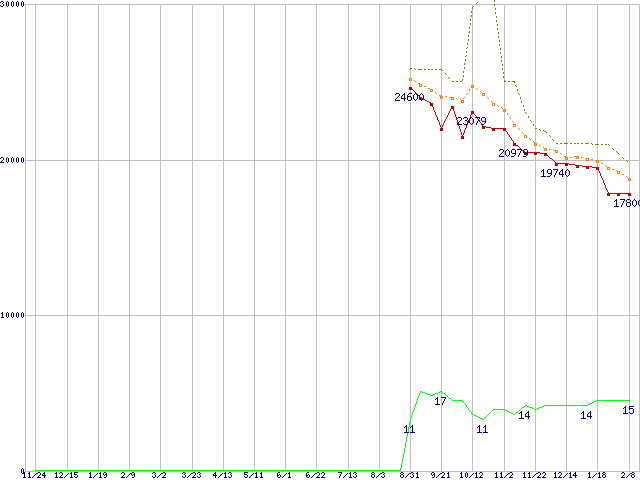 ※このグラフは過去のデータも税率5%相当に調整した税込み相当額のグラフです。 税率変更や、総額表示方式導入(2004年4月)の影響は除いています。 | | | ●凡例 | 最安値 (点線部は販売店未確認 または未調査) | 平均値 | 最高値 | ショップ数 |