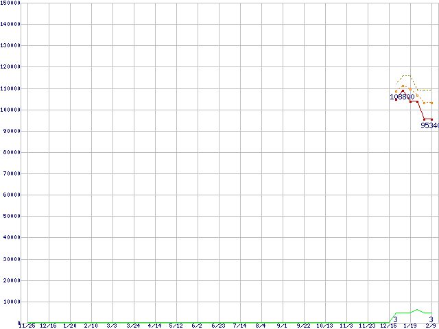 ※このグラフは過去のデータも税率5%相当に調整した税込み相当額のグラフです。 税率変更や、総額表示方式導入(2004年4月)の影響は除いています。 | | | ●凡例 | 最安値 (点線部は販売店未確認 または未調査) | 平均値 | 最高値 | ショップ数 |