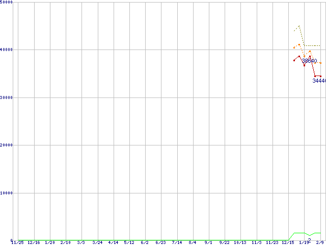 ※このグラフは過去のデータも税率5%相当に調整した税込み相当額のグラフです。 税率変更や、総額表示方式導入(2004年4月)の影響は除いています。 | | | ●凡例 | 最安値 (点線部は販売店未確認 または未調査) | 平均値 | 最高値 | ショップ数 |
