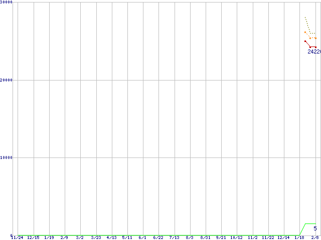※このグラフは過去のデータも税率5%相当に調整した税込み相当額のグラフです。 税率変更や、総額表示方式導入(2004年4月)の影響は除いています。 | | | ●凡例 | 最安値 (点線部は販売店未確認 または未調査) | 平均値 | 最高値 | ショップ数 |