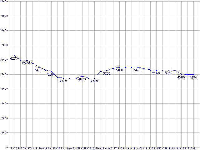 | PC3200(DDR400) DDR SDRAM DIMMの最安値推移 | | | (2007年6月30日~2008年2月9日) |