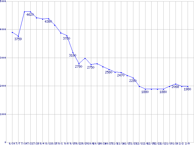 | PC2-5300(DDR2-667) DDR2 SDRAM DIMMの最安値推移 | | | (2007年6月30日~2008年2月9日) |
