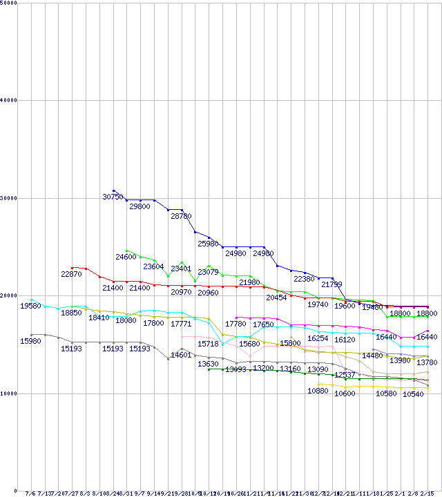 | CPU主要製品(最安値1万円~2万円未満)の最安値推移 | | | (2007年7月6日~2008年2月15日) |