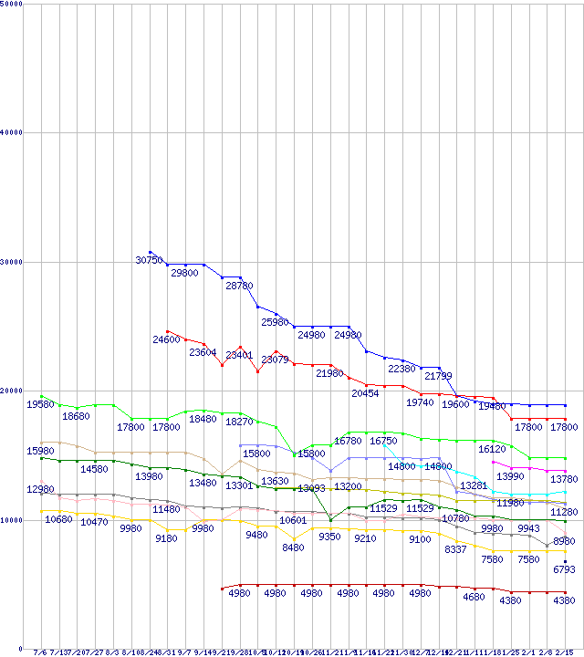 | AMD系CPUの最安値推移 | | | (2007年7月6日~2008年2月15日) |
