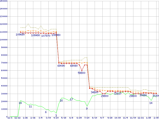 | Core 2 Quad Q6600 (2.40GHz,L2 4MB×2)の価格推移 | | | (2006年12月1日~2008年2月15日) |