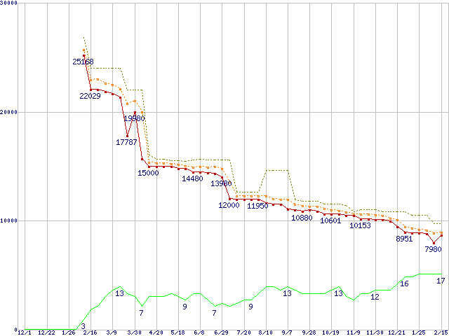 | Athlon 64 X2 4400+ (2.3GHz,L2 512KB×2,TDP65W)の価格推移 | | | (2006年12月1日~2008年2月15日) |
