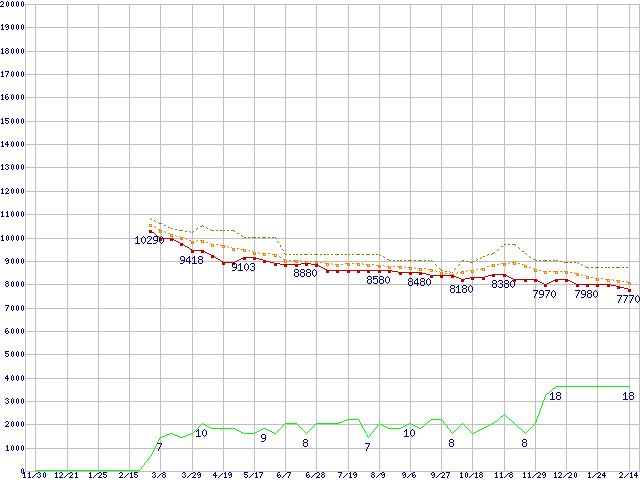 ※このグラフは過去のデータも税率5%相当に調整した税込み相当額のグラフです。 税率変更や、総額表示方式導入(2004年4月)の影響は除いています。 | | | ●凡例 | 最安値 (点線部は販売店未確認 または未調査) | 平均値 | 最高値 | ショップ数 |