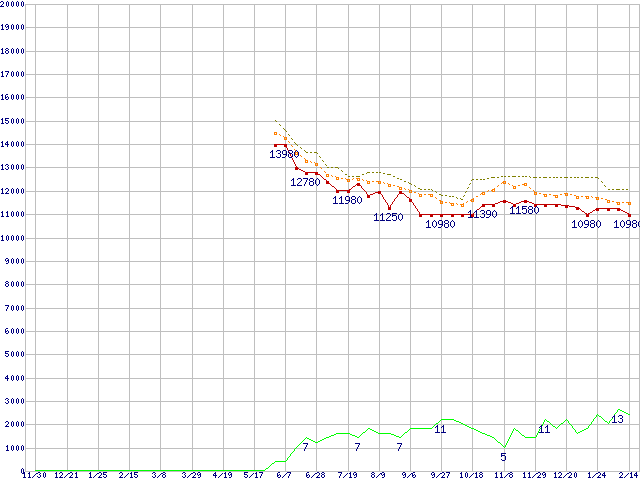 ※このグラフは過去のデータも税率5%相当に調整した税込み相当額のグラフです。 税率変更や、総額表示方式導入(2004年4月)の影響は除いています。 | | | ●凡例 | 最安値 (点線部は販売店未確認 または未調査) | 平均値 | 最高値 | ショップ数 |