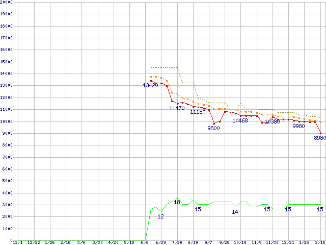 | Athlon X2 BE-2350 (2.1GHz,L2 512KB×2)の価格推移 | | | (2006年12月1日~2008年2月15日) |