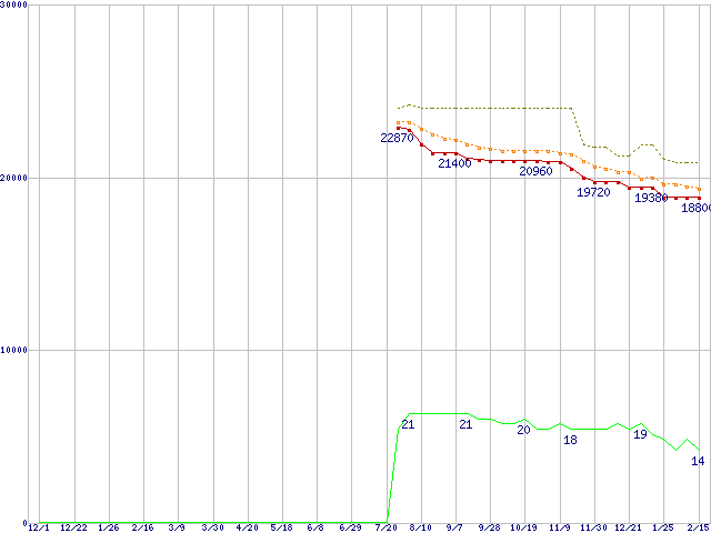 ※このグラフは過去のデータも税率5%相当に調整した税込み相当額のグラフです。 税率変更や、総額表示方式導入(2004年4月)の影響は除いています。 | | | ●凡例 | 最安値 (点線部は販売店未確認 または未調査) | 平均値 | 最高値 | ショップ数 |