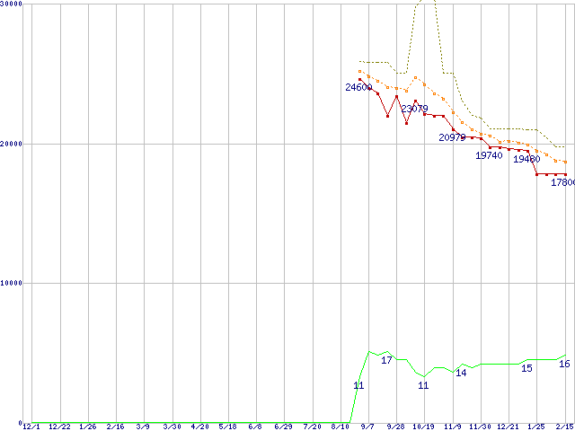 ※このグラフは過去のデータも税率5%相当に調整した税込み相当額のグラフです。 税率変更や、総額表示方式導入(2004年4月)の影響は除いています。 | | | ●凡例 | 最安値 (点線部は販売店未確認 または未調査) | 平均値 | 最高値 | ショップ数 |