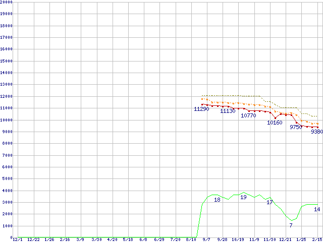 ※このグラフは過去のデータも税率5%相当に調整した税込み相当額のグラフです。 税率変更や、総額表示方式導入(2004年4月)の影響は除いています。 | | | ●凡例 | 最安値 (点線部は販売店未確認 または未調査) | 平均値 | 最高値 | ショップ数 |