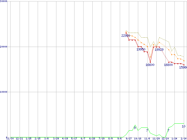 ※このグラフは過去のデータも税率5%相当に調整した税込み相当額のグラフです。 税率変更や、総額表示方式導入(2004年4月)の影響は除いています。 | | | ●凡例 | 最安値 (点線部は販売店未確認 または未調査) | 平均値 | 最高値 | ショップ数 |