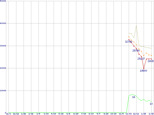 | Phenom 9600 (2.3GHz,L2 512KB×4,L3 2MB)の価格推移 | | | (2006年12月1日~2008年2月15日) |