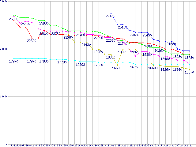 HDD主要製品(最安値1万5千円~2万円未満)の最安値推移