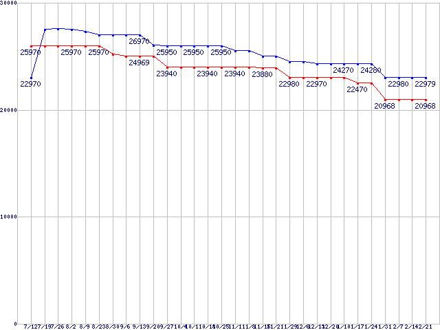 HDD 30GB~80GB未満の最安値推移