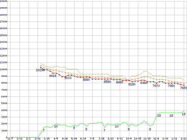 ※このグラフは過去のデータも税率5%相当に調整した税込み相当額のグラフです。 税率変更や、総額表示方式導入(2004年4月)の影響は除いています。 | | | ●凡例 | 最安値 (点線部は販売店未確認 または未調査) | 平均値 | 最高値 | ショップ数 |