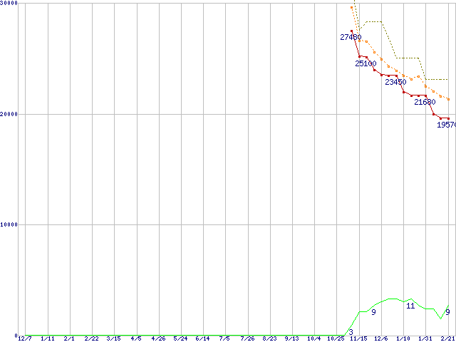 ※このグラフは過去のデータも税率5%相当に調整した税込み相当額のグラフです。 税率変更や、総額表示方式導入(2004年4月)の影響は除いています。 | | | ●凡例 | 最安値 (点線部は販売店未確認 または未調査) | 平均値 | 最高値 | ショップ数 |