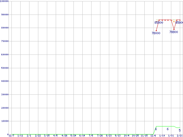 ※このグラフは過去のデータも税率5%相当に調整した税込み相当額のグラフです。 税率変更や、総額表示方式導入(2004年4月)の影響は除いています。 | | | ●凡例 | 最安値 (点線部は販売店未確認 または未調査) | 平均値 | 最高値 | ショップ数 |