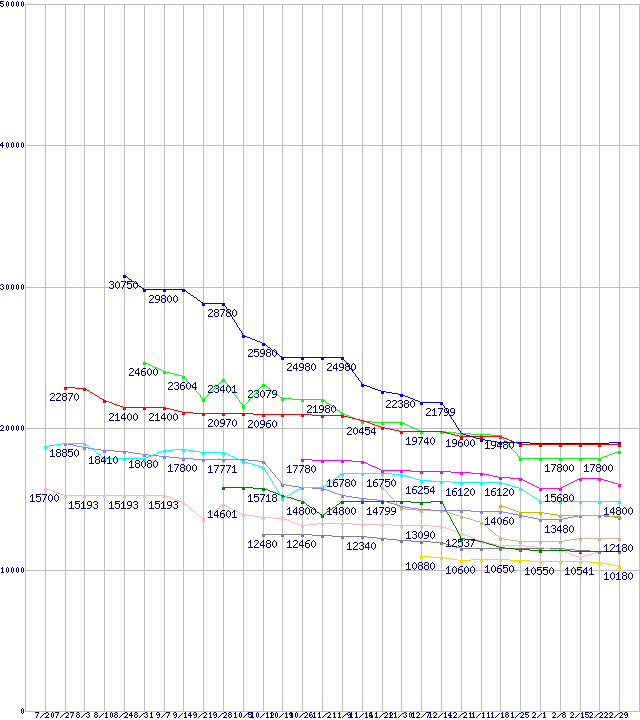 | CPU主要製品(最安値1万円~2万円未満)の最安値推移 | | | (2007年7月20日~2008年2月29日) |