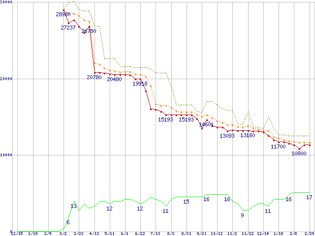| Athlon 64 X2 5000+ (2.6GHz,L2 512KB×2,TDP65W)の価格推移 | | | (2006年12月15日~2008年2月29日) |