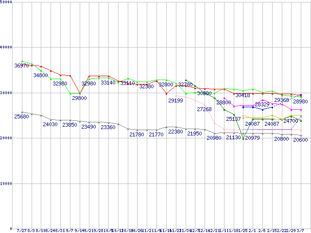 | CPU主要製品(最安値2万円~3万円未満)の最安値推移 | | | (2007年7月27日~2008年3月7日) |