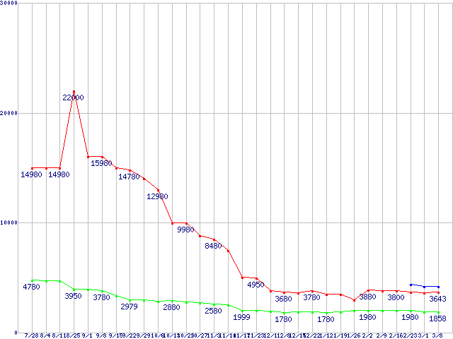 メモリ主要製品(最安値5千円未満)の最安値推移