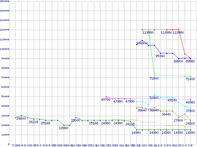 メモリ主要製品(最安値1万円以上)の最安値推移