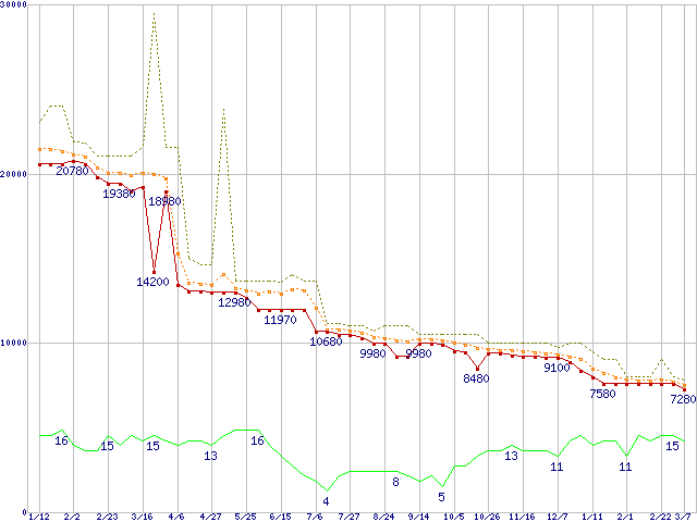 ※このグラフは過去のデータも税率5%相当に調整した税込み相当額のグラフです。 税率変更や、総額表示方式導入(2004年4月)の影響は除いています。 | | | ●凡例 | 最安値 (点線部は販売店未確認 または未調査) | 平均値 | 最高値 | ショップ数 |