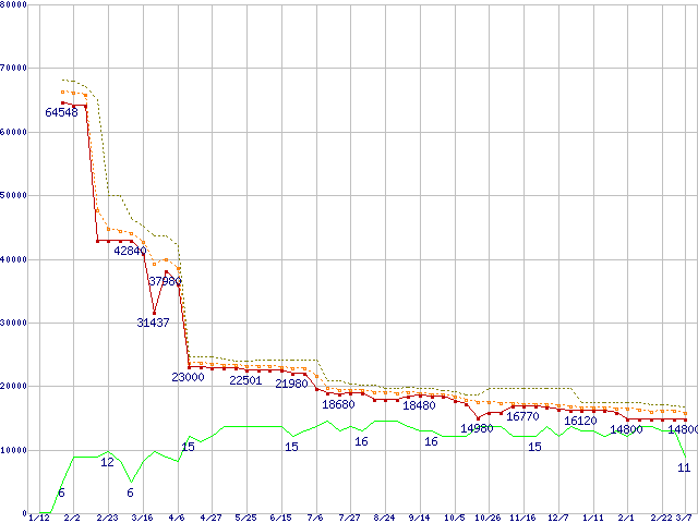 ※このグラフは過去のデータも税率5%相当に調整した税込み相当額のグラフです。 税率変更や、総額表示方式導入(2004年4月)の影響は除いています。 | | | ●凡例 | 最安値 (点線部は販売店未確認 または未調査) | 平均値 | 最高値 | ショップ数 |