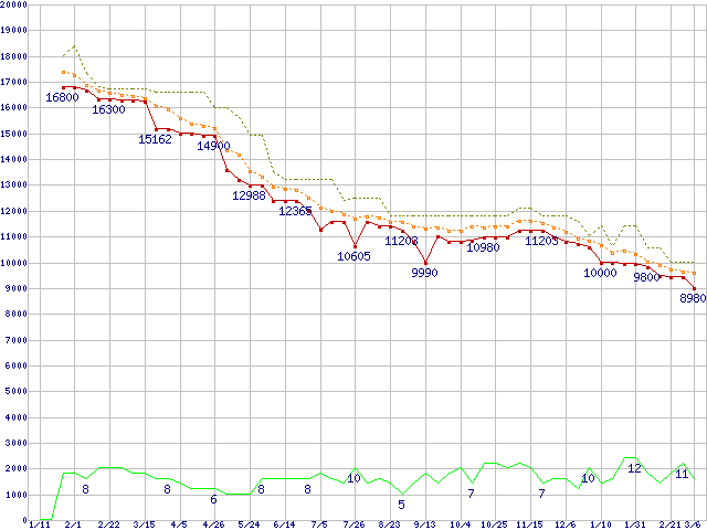 ※このグラフは過去のデータも税率5%相当に調整した税込み相当額のグラフです。 税率変更や、総額表示方式導入(2004年4月)の影響は除いています。 | | | ●凡例 | 最安値 (点線部は販売店未確認 または未調査) | 平均値 | 最高値 | ショップ数 |