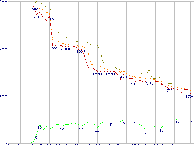 | Athlon 64 X2 5000+ (2.6GHz,L2 512KB×2,TDP65W)の価格推移 | | | (2007年1月12日~2008年3月7日) |