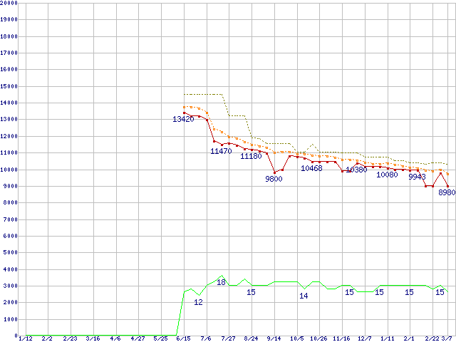 ※このグラフは過去のデータも税率5%相当に調整した税込み相当額のグラフです。 税率変更や、総額表示方式導入(2004年4月)の影響は除いています。 | | | ●凡例 | 最安値 (点線部は販売店未確認 または未調査) | 平均値 | 最高値 | ショップ数 |