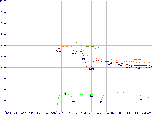 ※このグラフは過去のデータも税率5%相当に調整した税込み相当額のグラフです。 税率変更や、総額表示方式導入(2004年4月)の影響は除いています。 | | | ●凡例 | 最安値 (点線部は販売店未確認 または未調査) | 平均値 | 最高値 | ショップ数 |