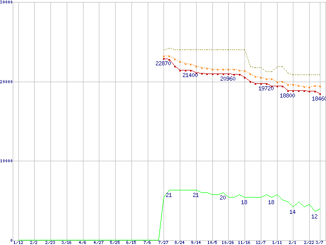 ※このグラフは過去のデータも税率5%相当に調整した税込み相当額のグラフです。 税率変更や、総額表示方式導入(2004年4月)の影響は除いています。 | | | ●凡例 | 最安値 (点線部は販売店未確認 または未調査) | 平均値 | 最高値 | ショップ数 |