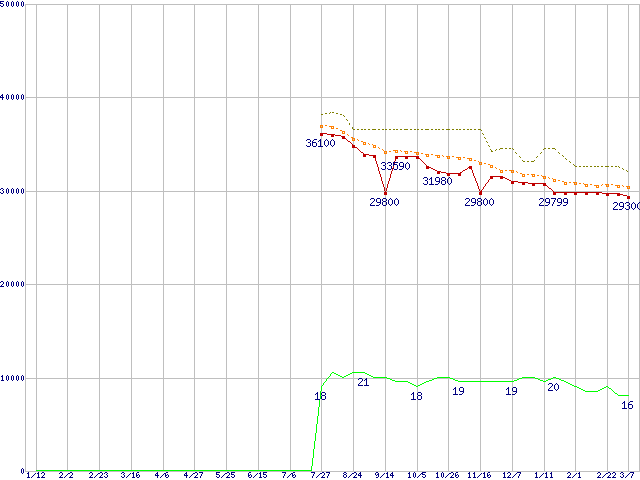 | Core 2 Duo E6850 (3GHz,L2 4MB)の価格推移 | | | (2007年1月12日~2008年3月7日) |
