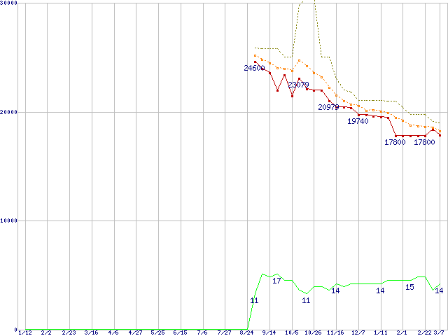 ※このグラフは過去のデータも税率5%相当に調整した税込み相当額のグラフです。 税率変更や、総額表示方式導入(2004年4月)の影響は除いています。 | | | ●凡例 | 最安値 (点線部は販売店未確認 または未調査) | 平均値 | 最高値 | ショップ数 |