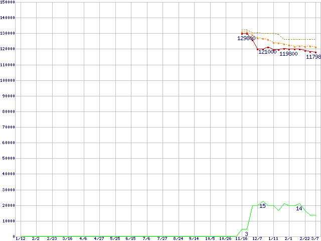 ※このグラフは過去のデータも税率5%相当に調整した税込み相当額のグラフです。 税率変更や、総額表示方式導入(2004年4月)の影響は除いています。 | | | ●凡例 | 最安値 (点線部は販売店未確認 または未調査) | 平均値 | 最高値 | ショップ数 |
